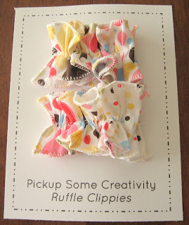 So, I worked out some kinks...and whipped up a bunch of my new ruffle clips. I tried a few different ways to finish the edges of the fabric...and I can't say I have a favorite...I like them all.